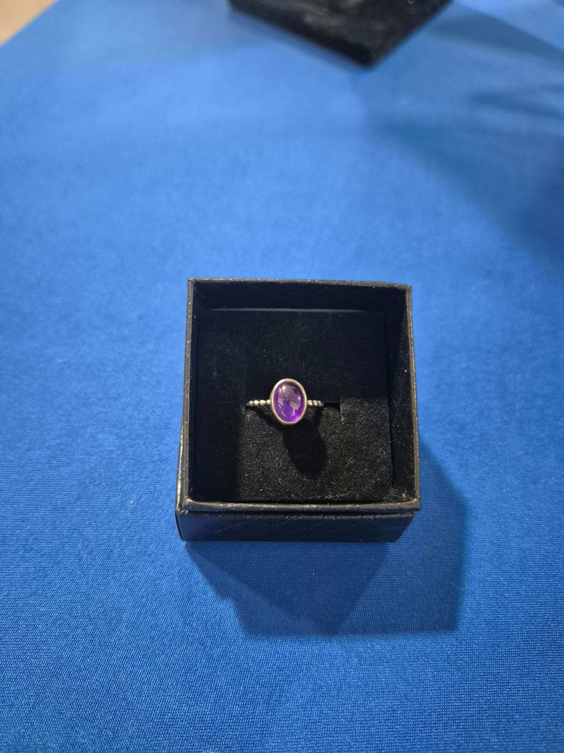 This handmade sterling silver ring features a oval shaped genuine amethyst cabochon and a beaded detail sterling silver band
