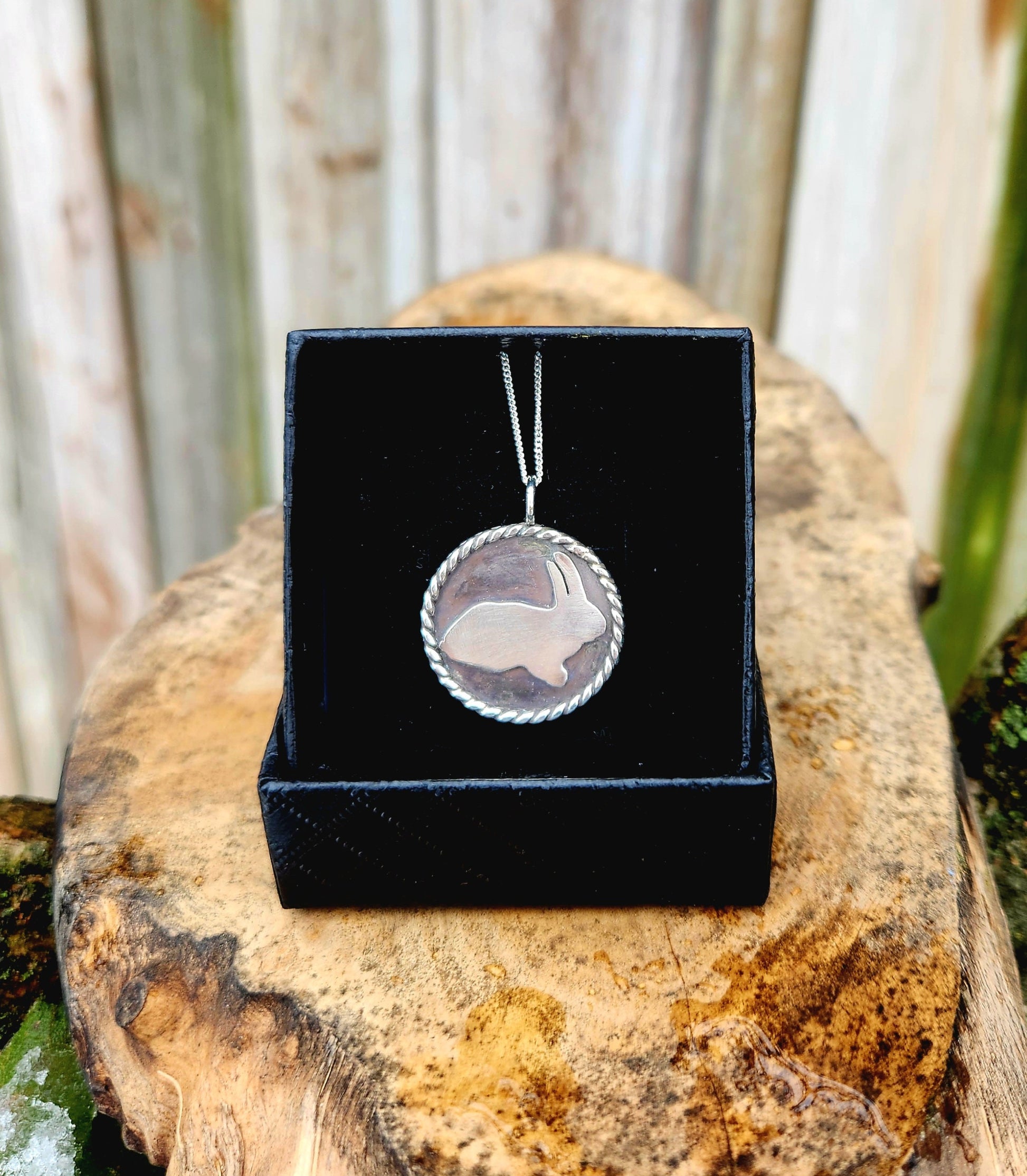 Evoke a sense of charm and luck with our handmade sterling silver lucky rabbit pendant. Meticulously crafted, this whimsical accessory features a detailed rabbit design, symbolizing good fortune and positive energy. Rabbits also represent fertility, agility, and abundance due to their prolific nature. The sterling silver adds a touch of elegance, making it a versatile piece for everyday wear or a thoughtful gift. Embrace the enchanting allure of this unique pendant, a symbol of joy and prosperity that accompanies you wherever you go. Comes with your choice of 16, 18 or 20 inch sterling silver chain
