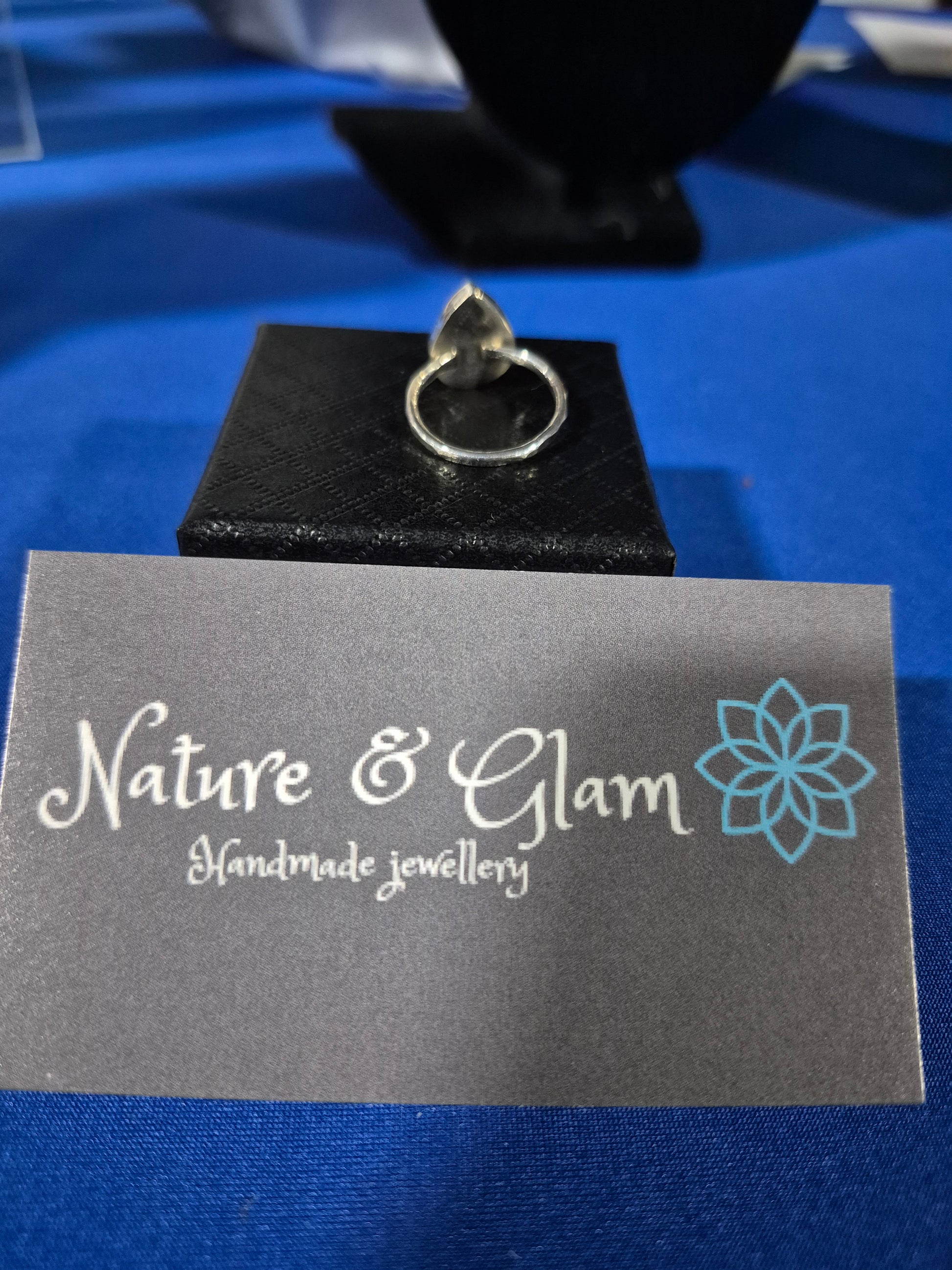 Handmade sterling silver teardrop faceted larimar ring with hammered band. Size 5.5