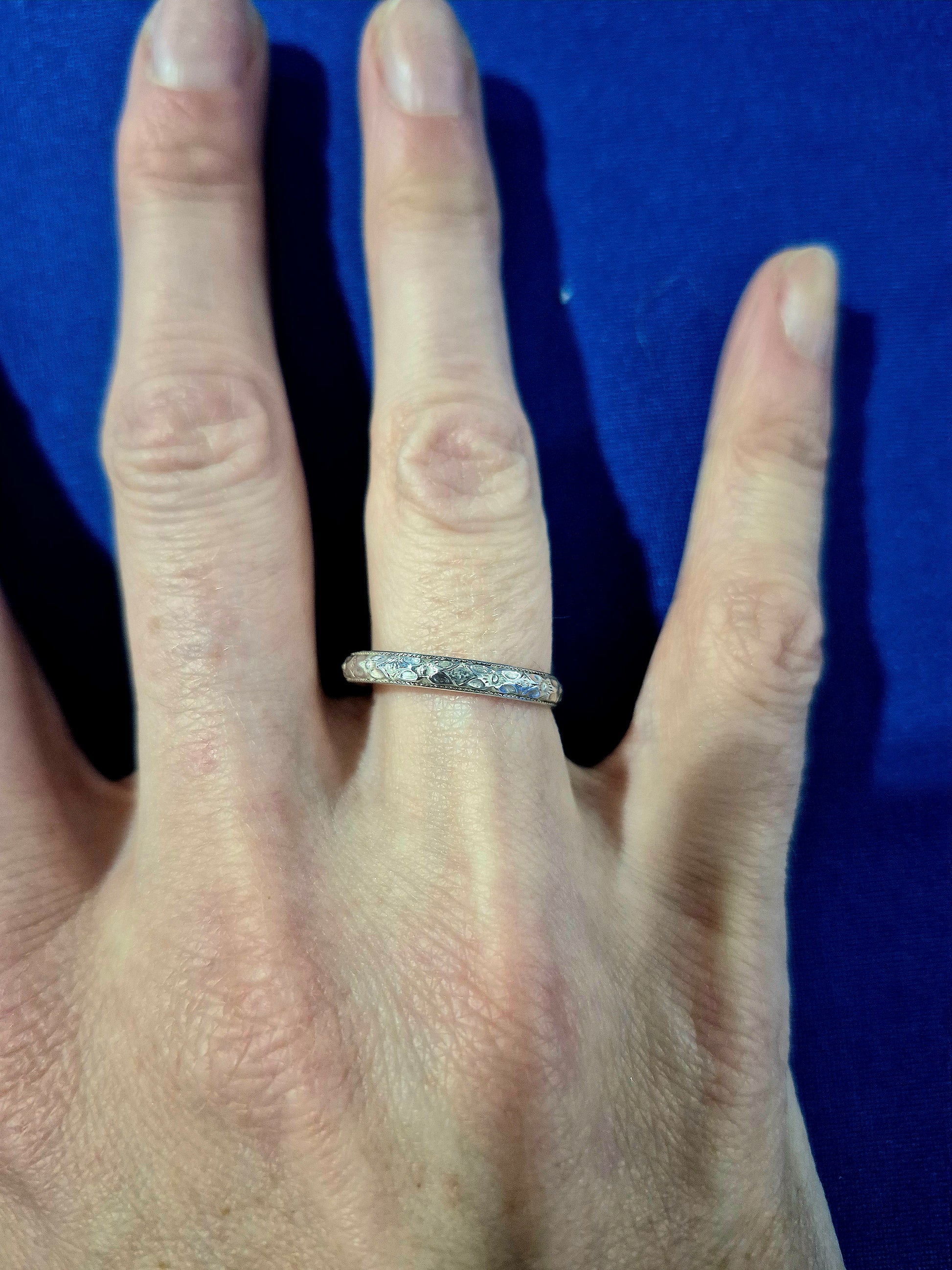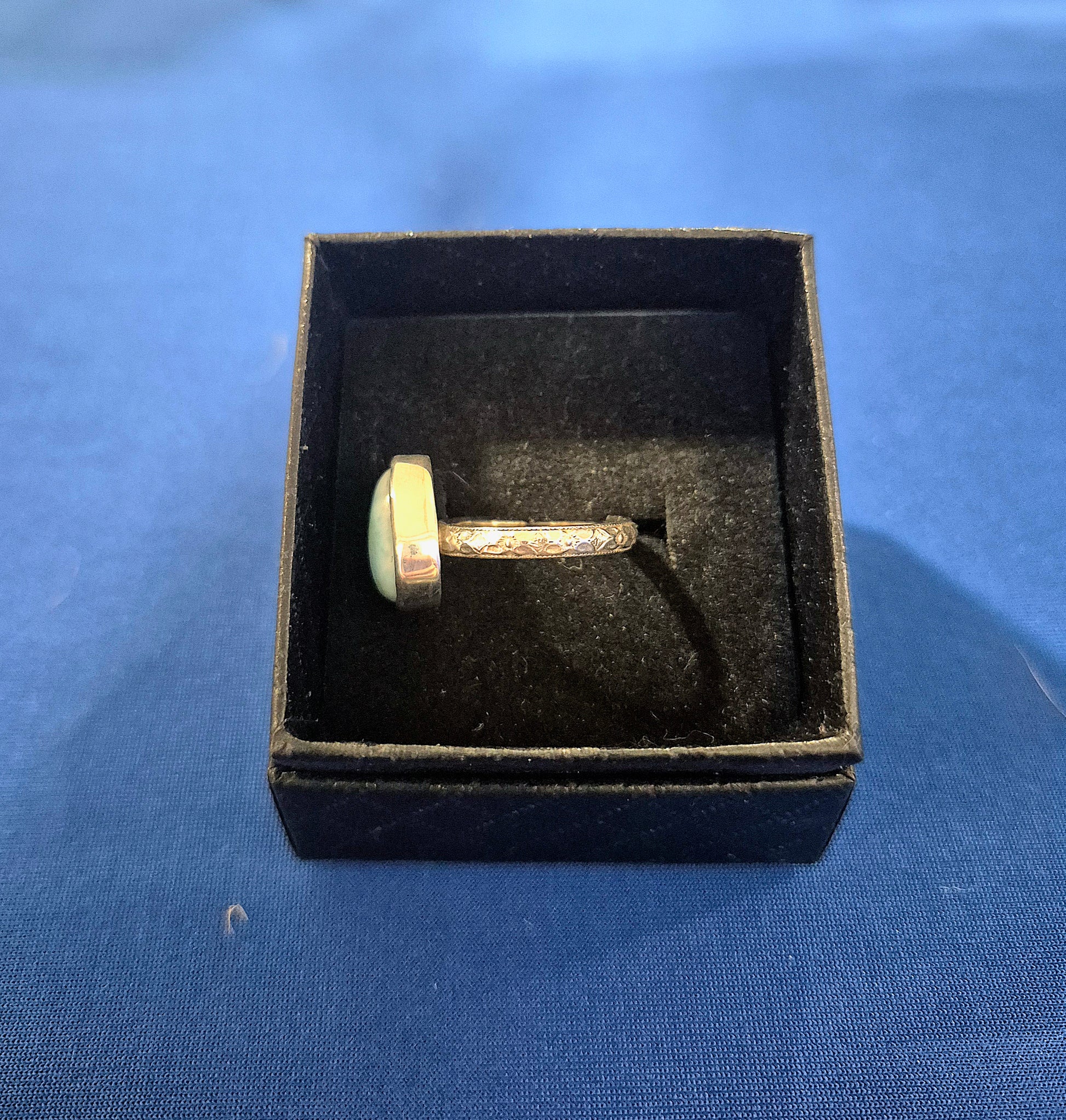 This handmade sterling silver ring features a teardrop shape beautiful larimar originating from the Dominican Republic. The band is embellished with floral detail